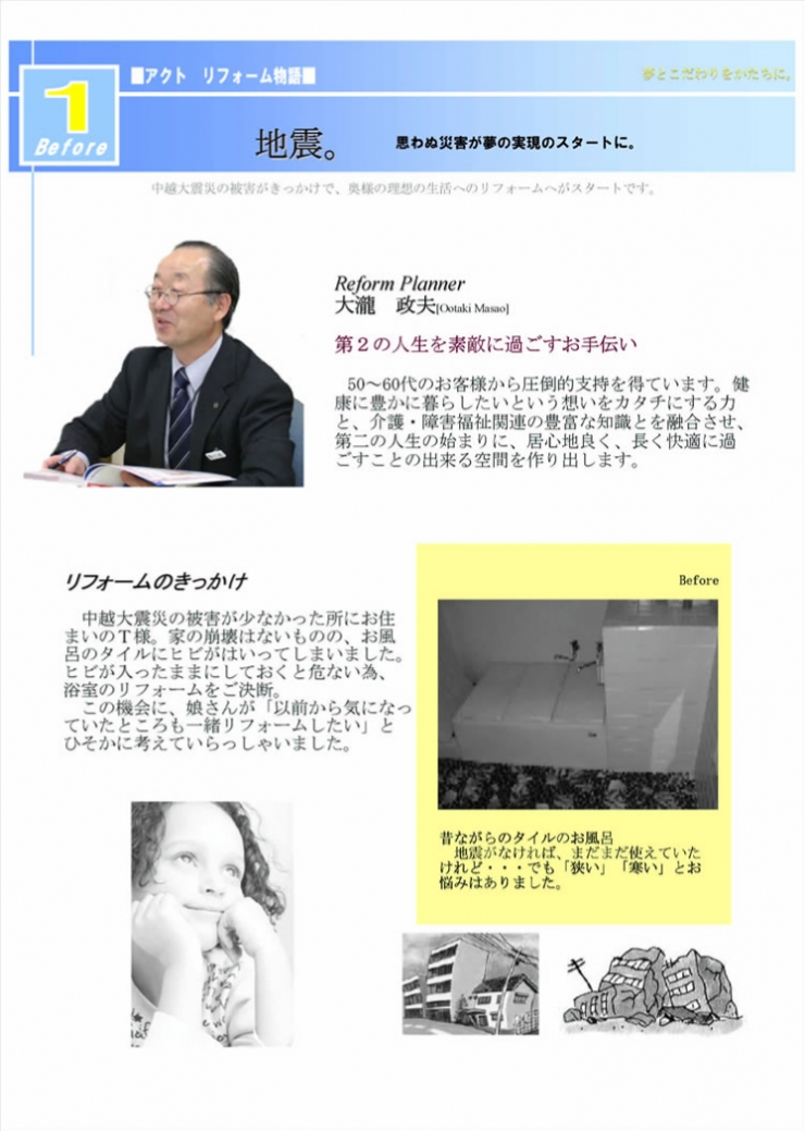 第七章 夢とこだわりをかたちに。 想い描いていた理想の空間を実現 物語のきっかけは中越地震でタイルにひびが入ってしまった浴室。浴室リフォームとともに、以前から気になっていた台所もリフォームすることになりました。娘さんの頭の中には既にたくさんの夢のプランがありました。 アクトのリフォーム物語トップへ戻る>>