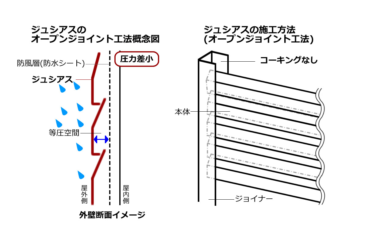 一方、ジュシアスは、樹脂の特徴である「撥水性(水をはじく性質)」があり、コーキングを使用しないいオープンジョイント構法なので、壁内外の圧力差が小さく隙間から水が入りにくいです。